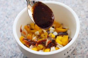 焯好水的彩椒和香菇丁捞出来放在碗中,加入一勺黑胡椒酱搅拌均匀
