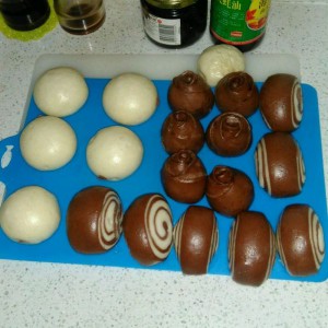 把发酵好的面团排气,揉光滑,想做可可卷的把一半的面团加入适量可可粉,揉成可可色,然后赶成薄薄的园片,再把没加原色的也赶成圆片,两块叠在一起,卷起来,切成均匀的小块。上火蒸20分钟左右,就可以了。好吃。