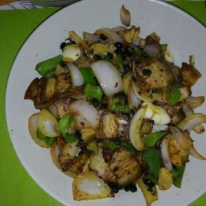 将肉片放入油锅中翻炒至微卷,捞起。再将适量生姜大蒜用锅中油爆香,再加入豆豉和洋葱青椒翻炒。最后将炒好的肉片加入其中翻炒。