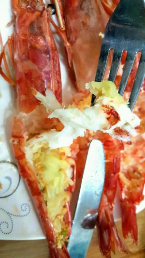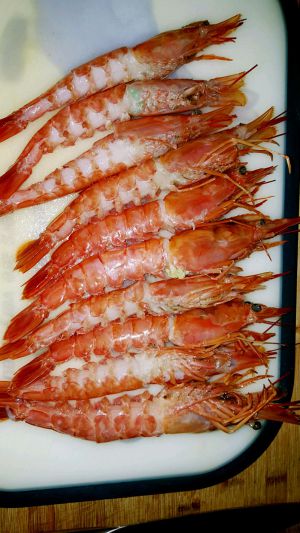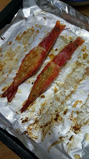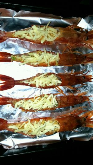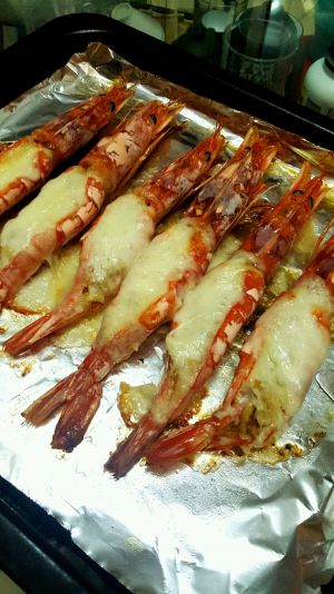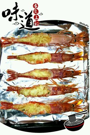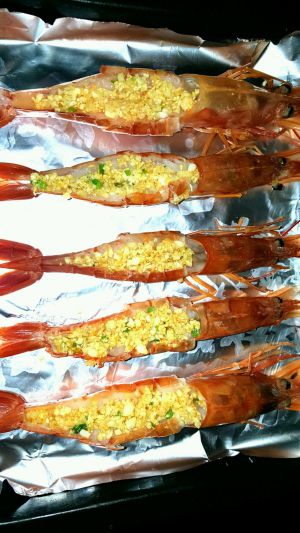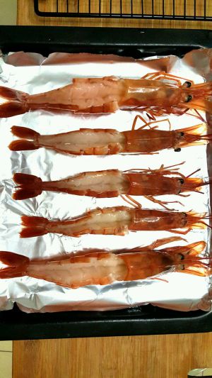 烤盘上铺锡纸,将虾摆好,180度预热烤箱