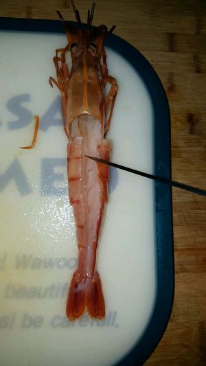 用刀将左右两边虾肉轻轻切断,不要切掉啊,连着的,这样防止烤得时候虾蜷曲变形