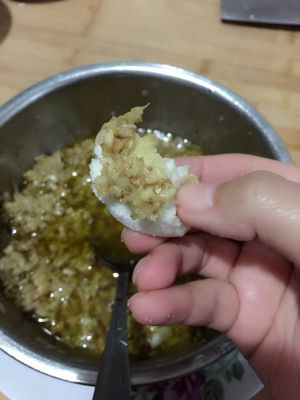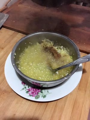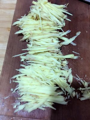 将熟好的热油(植物油)泼入,边泼边搅拌,保证生姜熟透。