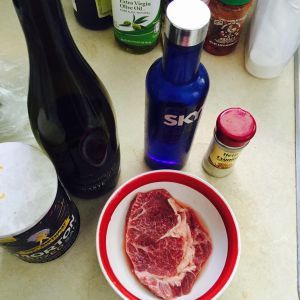 双面均匀撒少许盐和白胡椒,外加一瓶盖伏特加,研制半小时