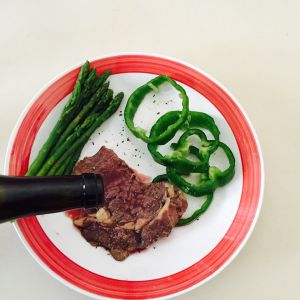 从烤箱拿出考好的牛肉,浇上红酒,撒上罗勒叶,懒人牛排做好了。既保持了牛肉的原味,又有红酒的香味。如果喜欢重口味的朋友,可以熬制一点别的酱汁浇上去。