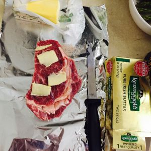 拿出腌制好的牛排,双面均匀涂抹胡椒,放上黄油,用锡纸包起来,烤箱350度烤15-20分钟,根据自己喜好,20分钟全熟。