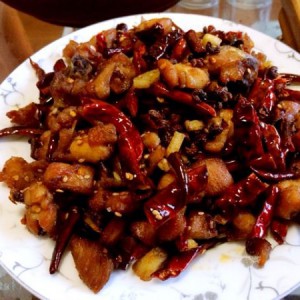 锅内适量油烧热,加入姜蒜、辣椒、花椒等(一定要小火爆锅,不然干红椒很容易就糊了。)煸出香味后加入炸好的鸡丁,继续翻炒。