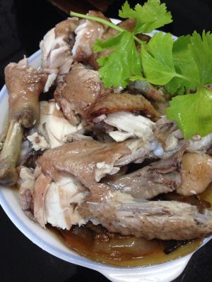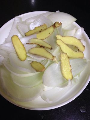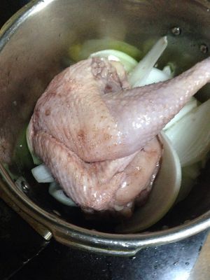 腌制好鸡的红酒要倒掉,再把洋葱和姜、鸡依次放入高压锅里,再放入盐和糖(可以适当地加一点水)煮25分钟,然后闷十五分钟。
