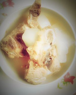 大火煮二十分钟后加入萝卜,加入后大火煮几分钟就加盐便可以小火了,至于小火煮多久,看个人喜欢,我一般喜欢吃烂点的就会煮久点!
