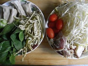 食材:咸肉(切片)、绿豆芽、小番茄、扁尖(撕条)、燕饺(速冻暖锅食品)、小青菜(用菜芯)。所有食材洗净,燕饺除外