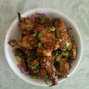 四、切些葱叶撒在鸡翅上,在撒上一些芝麻!