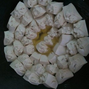 首先洗好锅子放油下去煎煎锅,然后每小块豆腐对半切开成三角形状,接着把肉馅酿豆腐里面,酿好后放入用油煎过的锅,酿好一个放一个。
