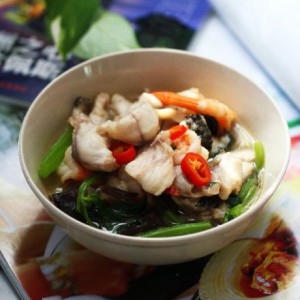 再倒入鱼汤,加黑木耳、盐、糖稍煮