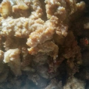 把和好米粉的肉放进笼屉里蒸熟,我们这喜欢把饭蒸在下面这样带有米粉的饭是很香的不用菜都能吃下去,蒸在下面的饭是那种半生的。我没尝试过不过我想家里没笼屉的可以尝试用电饭锅,有一点放肉的时候一定要等到水快干了