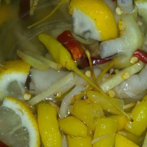 依次把料放进去,鸡爪,柠檬,蒜,姜,花椒,干辣椒,米醋,盐,然后放水盖过鸡爪,盖上密封罐的盖子,摇一摇,让料子充分覆盖鸡爪后放入冰箱(≧∇≦)