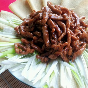 ok喽,肉丝盛入铺好的豆皮葱丝上。豆皮要用热水烫一下啊,那样吃起来才嫩嫩的。