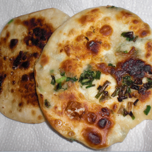 第二天从冰箱取出面团,稍微再揉两下,分成一个个小面团,小面团用手掌压依一下,将葱粒包裹进面团里,封口后用擀面杖擀成饼状。