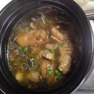 若干蘑菇和面色凝重的鸡肉,这次爆炒的时候加了酱油,颜色有点跑偏了。加两片姜,和一些葱。参片入锅。