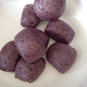 紫米磨成粉与面粉、糖混合备用。将干酵母倒入不烫手的温水中,轻轻搅匀后倒入面粉中