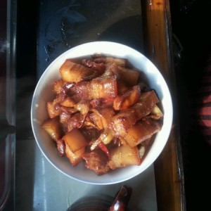 3 锅底下少许油,待油微热放入3勺糖,不断搅拌锅底至糖色成淡褐色(注意要用小火,不然烧的过焦会发苦),马上下入五花肉翻炒,上色均匀狗加入少许盐,不要放太多,加入料酒和适量水闷至柔熟透(时间充裕的话可以选择不放水,开锅后关小火闷煮30分钟,这样更好吃),收汁,要见油不见水,把肉翻炒一下,色泽更亮,盛盘(用了两道控油,吃起来写好也不腻)