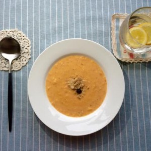 倒回锅里,加牛奶小火慢煮,加入焙煎芝麻酱两大勺,肉桂粉1/2茶匙,砂糖1/2茶匙,适量盐和黑胡椒碎调味。