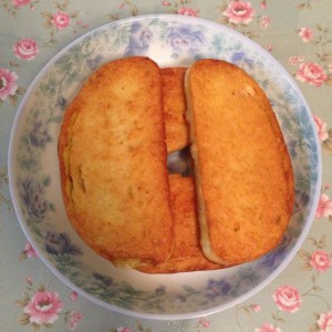 平底锅开火,倒入适量花生油,待油温慢慢上升,拿馒头片迅速迅速粘蛋液,两面都粘均匀蛋液;