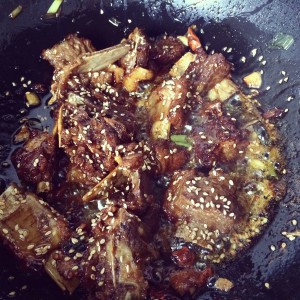锅里放入油,然后取出3块冰糖。冰糖融化的时候将腌制好的小排倒入锅里慢慢炒(这时火不要开的太大)然后将腌制时候用的料都倒进去,再倒进半碗开水。先用大火后用小火慢慢翻炒。在收汁时放入葱蒜等…