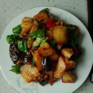 将土豆,茄子,辣椒放入锅中,大火炒几下,至材料裹匀料汁即可。