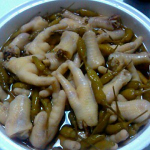 将煮好的鸡爪用凉水洗干净,加入一瓶糟卤和一瓶泡椒,大功告成