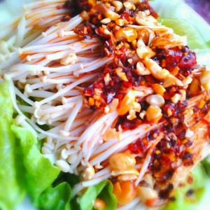 淋在金针菇上即可,我在盘底铺了几片生菜,妹妹一个人吃了一大半噢!嘻嘻…