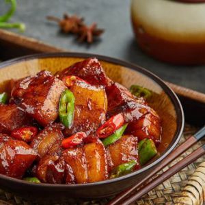 差不多大火煮15分钟后,倒入生抽、老抽和腐乳翻炒均匀。然后开小火给它焖煮40分钟,把五花肉炖煮软烂
