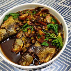 鱼两面煎好后加入生抽、老抽、少许糖、盐,加入剥好蒜头,注入没过鱼的开水,锅开后小火炖煮。
