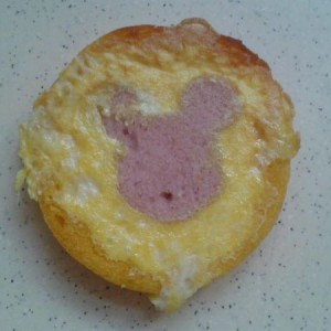 因为没有煎蛋器也没有洋葱,所以我就用了馒头皮做了外围,感觉色彩对比强烈的紫薯馒头不错。把扣好的模子放到馒头皮中间,空隙注入加盐调好的鹅蛋糊,电饼铛抹油加热,煎熟即可。公主觉得还不错,吃了一个米奇嘀。