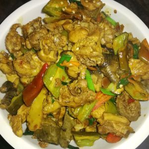 炒香后倒入焯水洗净滤水后的鸡块,大火继续翻炒,中间倒入陈醋约2大勺