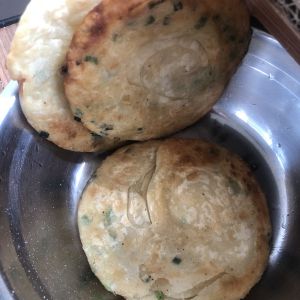 面团擀成饼,抹油酥,撒葱花,卷起来,再盘起来,按成饼状,再擀成饼