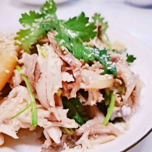 蒸熟后拿出放凉,把鸡肉撕成丝,加入适量盐焗鸡粉,熟芝麻,芝麻油,香菜,用手抓拌均匀