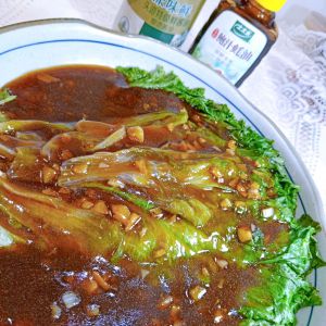 蒜切末,生菜洗净开水烫10秒钟断生拿出来摆盘,大叶在下小叶在上面好看,烫久了菜变色不好看