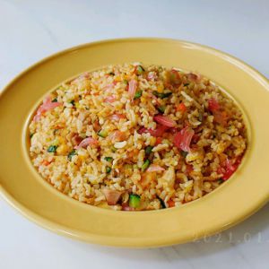 搁饭中间扒个坑出来,看心情补油扔熟肉,炖肉虾仁火腿肠喵饭余料熟鸡腿都可以