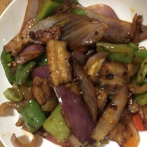然后把配菜辣椒圆葱切好备用,肉皮我把剃下来准备和菜一起下锅,所以没有放在肉盘子里