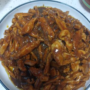 锅里放油,放甜面酱,海鲜酱油,蚝油,料酒,白糖,炒到白糖完全融化,放入肉丝,翻炒均匀出锅