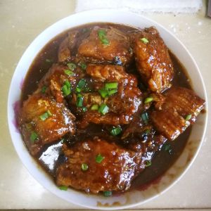 烹入料酒,加生抽、老抽、蚝油、香醋(先放一半)盖上锅盖大火收汁,汁水差不多,剩下香醋沿着锅边倒下,汁水多少根据个人喜好而定!