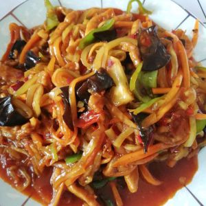第四步,油热下入蒜末和姜末,加入肉丝,炒至变色,盛出备用。锅中加一勺豆瓣酱,加入准备好的莴笋丝,胡萝卜丝,木耳丝,青椒丝,炒至断生倒肉丝,最后到入调好的鱼香汁,翻炒几分钟就可以出锅啦~