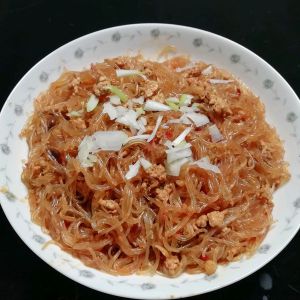 煮沸后,下入粉丝翻炒,用少许盐调味。收汁即可出锅。