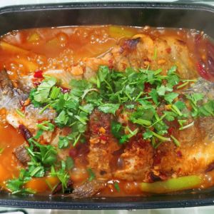 浇上刚刚炒好的汤汁,该锅盖闷煮10分钟,起锅撒上香菜,热气腾腾的烤鱼就好了。