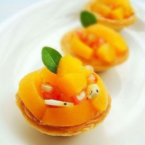 蛋挞出炉后,切点时令水果放上面即可食用。(我放了黄桃、石榴和猕猴桃,猕猴桃太酸,我少放了一点)