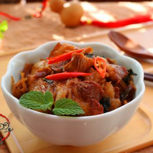 再遮上盖子继续焖煮20分钟,煮至食材水分收干,调入少许盐、鸡粉翻炒均匀即可铲起