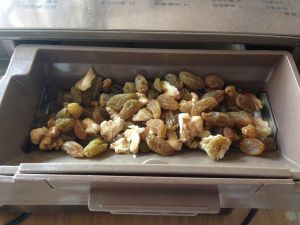 将核桃仁和葡萄干放入面包机的果料盒里。