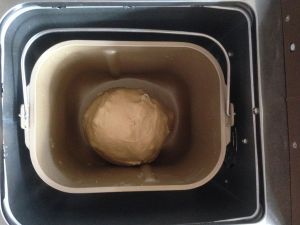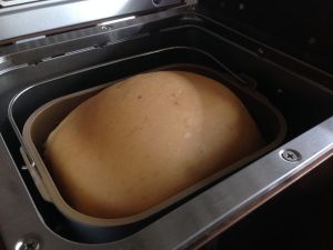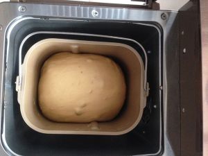 和面结束,进入发酵程序,发酵时间为60分钟。在面包桶上盖一块湿布,再盖上面包机盖。图片是发酵完毕的面团。