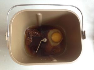 依次放入水、蛋液,对角放红糖和盐。