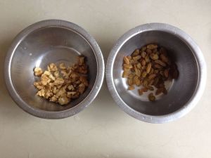 准备核桃仁碎,葡萄干用水泡软后,沥干水份备用。