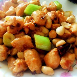 放入适量海鲜酱油、糖、醋、盐翻炒,加入大葱段,出锅前加入炒好的花生(记得调料一样一样加,此时该为中火,让每一种调料都进入鸡肉中)